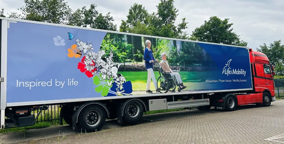 Een van onze trailers is onlangs volledig omgetoverd in de herkenbare en frisse huisstijl van onze opdrachtgever Life & Mobility BV.